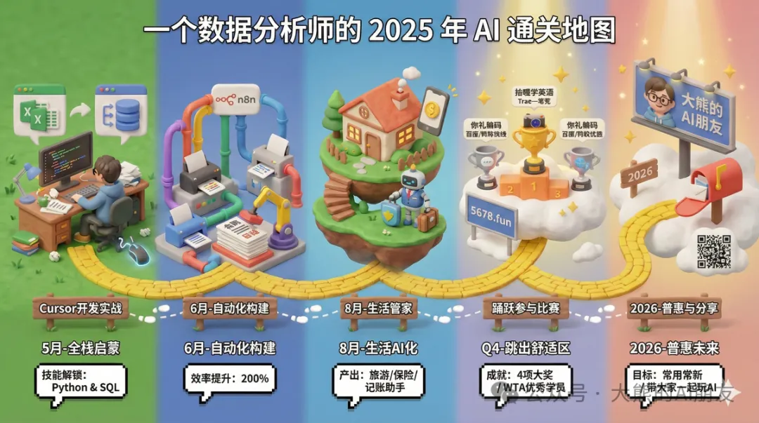 游戏直播数据分析师大熊在2025年实现了个人能力的巨大飞跃。他利用AI工具(如Cursor、n8n)打破了代码壁垒,从数据报表处理者进化为能独立开发全栈应用并在多项黑客松中获奖的创造者。他总结出核心经验:学习应源于痛点而非焦虑;清晰的业务逻辑比复杂提示词更重要;应优先完成可用产品而非追求完美。展望2026年,他计划通过公众号「大熊的AI朋友」分享实用AI方法论,帮助更多人拥抱AI浪潮,将梦想编译成现实。