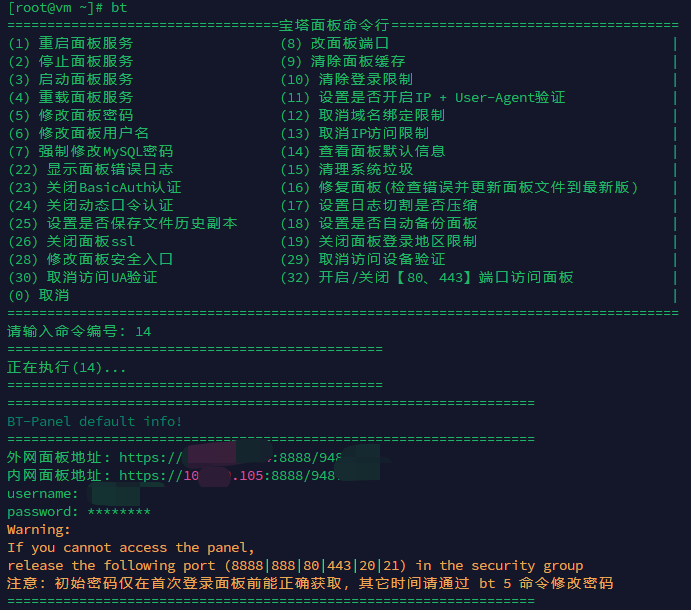 3.等待安装完成:安装过程可能需要几分钟时间,期间请不要中断操作。安装完成后,控制台会显示登录地址和账户密码。如果没有显示,输入bt,命令编号14即可查看。